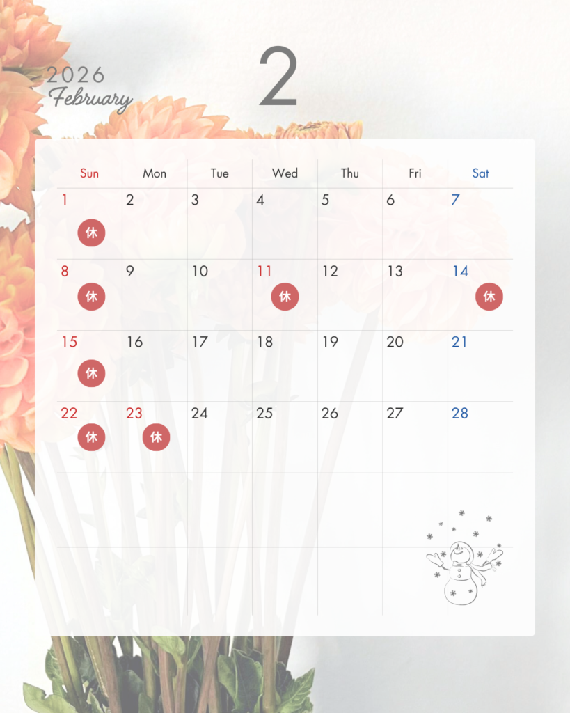さて、当店2月定休日のお知らせです。下記の通りご案内致しますので、ご確認ください。