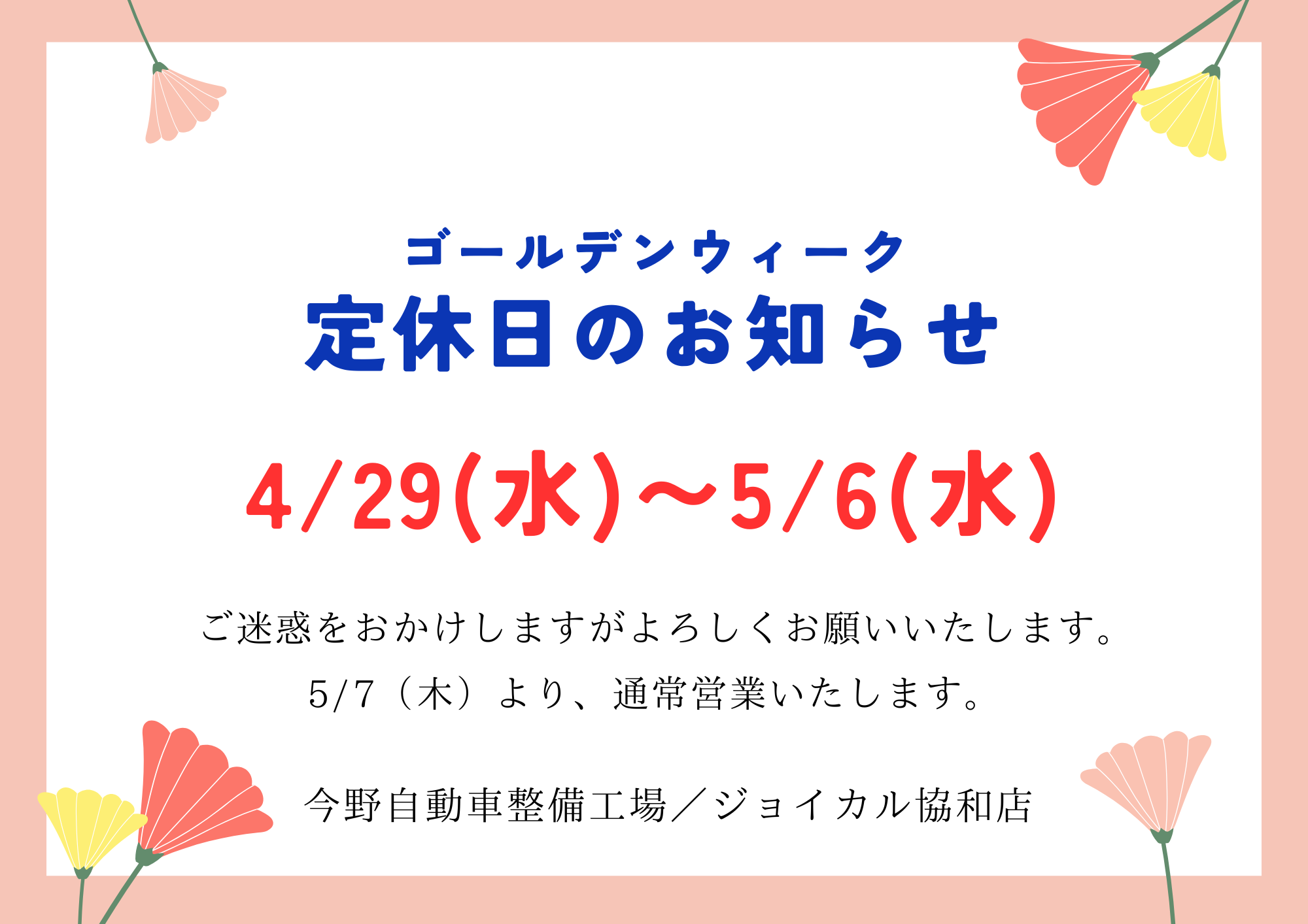 秋田県大仙市協和の今野自動車/R8ゴールデンウィーク休業日のお知らせ